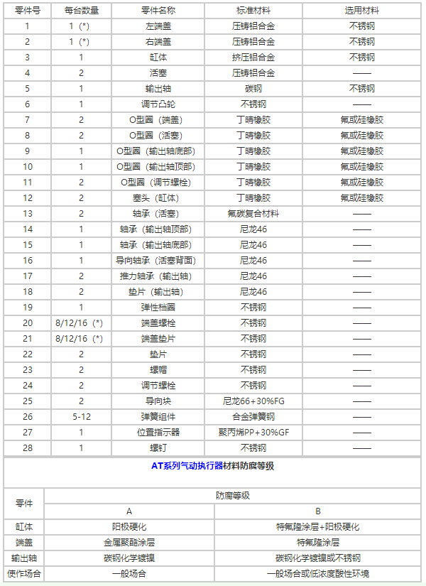 AT系列氣動執行器各零部件材料如下表: