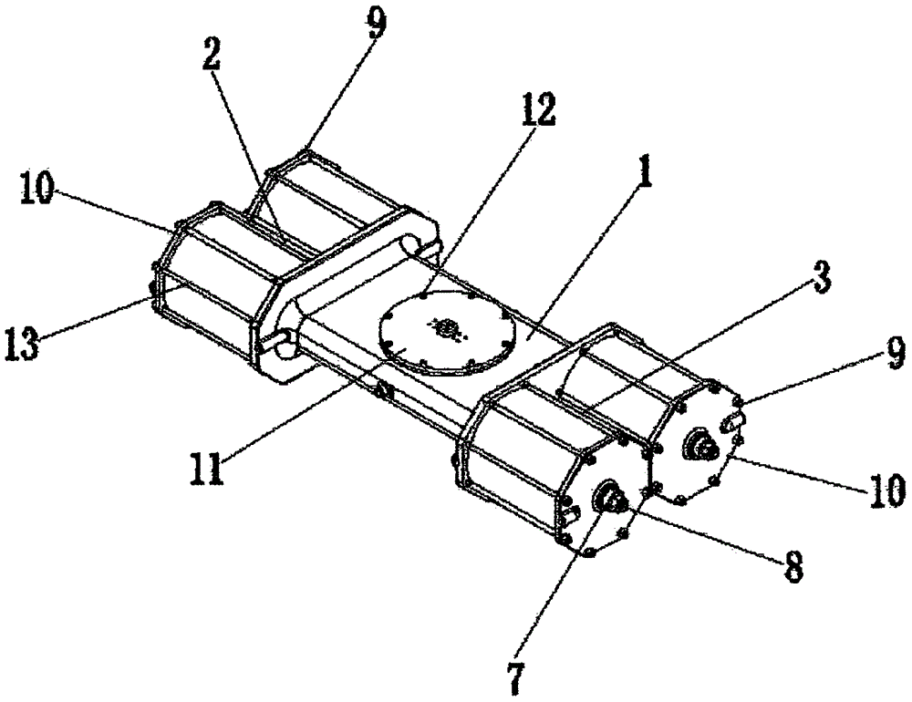 本實(shí)用新型工作原理:使用時(shí),通過設(shè)置的主齒輪14開始轉(zhuǎn)動(dòng),通過設(shè)置在其上的若干組鋸齒以及第一活塞桿4和第二活塞桿16上的凹槽組合運(yùn)動(dòng),并使設(shè)置的第一活塞桿4和第二活塞桿16反向運(yùn)動(dòng),從而帶動(dòng)活塞組件5在第一氣缸組2和第二氣缸組3內(nèi)部進(jìn)行往返運(yùn)動(dòng),調(diào)節(jié)內(nèi)部氣壓為整體裝置提高原動(dòng)力,且通過設(shè)置的上蓋11和上蓋螺釘12便于用戶對執(zhí)行器主體1進(jìn)行安裝和拆卸,并對其內(nèi)部進(jìn)行檢修和零部件的更換,同時(shí)通過設(shè)置的拉桿13和拉桿螺母9便于將端蓋10和第一氣缸組2、第二氣缸組3進(jìn)行固定安裝,從而大大增加了其穩(wěn)固性,于此同時(shí),通過設(shè)置的調(diào)節(jié)螺母7和調(diào)節(jié)螺栓8具有調(diào)節(jié)精度高的優(yōu)點(diǎn),整體裝置結(jié)構(gòu)簡單,性能更穩(wěn)定、調(diào)節(jié)精度高以及輸出扭矩平穩(wěn),具有一定的推廣價(jià)值。