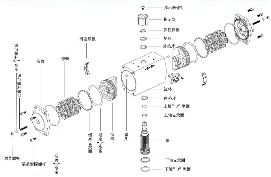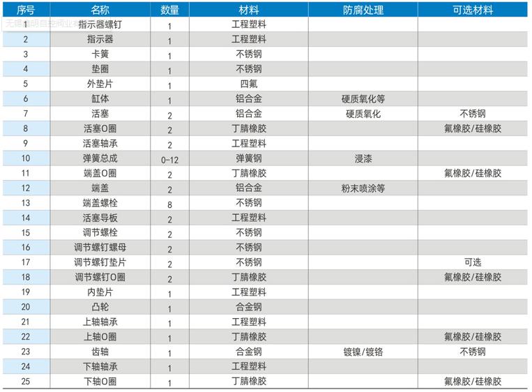 本公司生產(chǎn)的主要由氣缸、活塞、齒輪軸、端蓋、密封件、螺絲等組成;成套氣動(dòng)裝置還應(yīng)該包括開度指示、行程限位、電磁閥、定位器、氣動(dòng)元件、手動(dòng)機(jī)構(gòu)、信號(hào)反饋等部件組成。使用壽命長(zhǎng),抗腐蝕性能強(qiáng)。